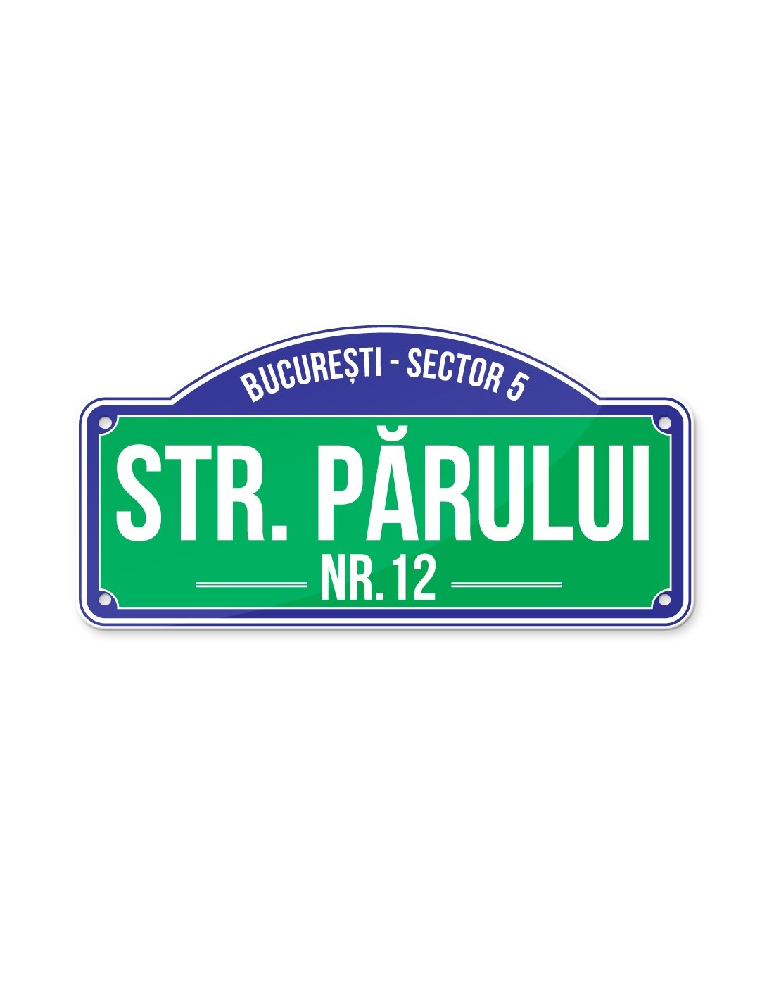 Placa de aluminiu personalizata cu vopsea UV, cu o forma atipica ce integreaza atat numarul cat si strada. Material: Aluminiu Personalizare: Prin vopsea UV + lac Dimensiuni: 33 x 16.5 cm Margine ambutesiata (in relief). Personalizarea se realizeaza cu vopsea UV si se lacuieste selectiv (tot ce e colorat), suprafata de culoare alba ramane mata.